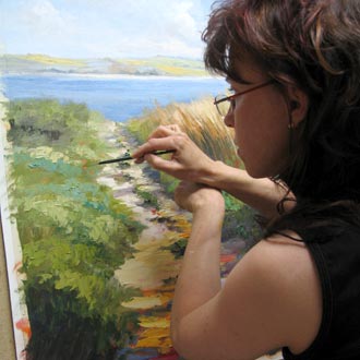In vielen Schichten, die unterschiedlich antrocknen müssen, angefangen von verschiedenen Lasuren bis zum pastosem Farbauftrag, erwächst langsam das Gemälde.